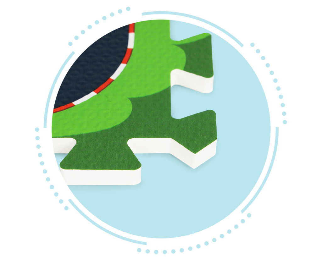 A szőnyeg színes négyzetekből áll, amelyek szélei különleges "fogakkal", amelyeknek köszönhetően mindenféleképpen kombinálhatók. A szőnyeg vastagsága (1 cm) megfelelő esés védelmet biztosít és kellemesen puhává teszi. A szőnyeg különleges csúszásmentes textúrával rendelkezik, és teljesen biztonságos a gyermekek számára.