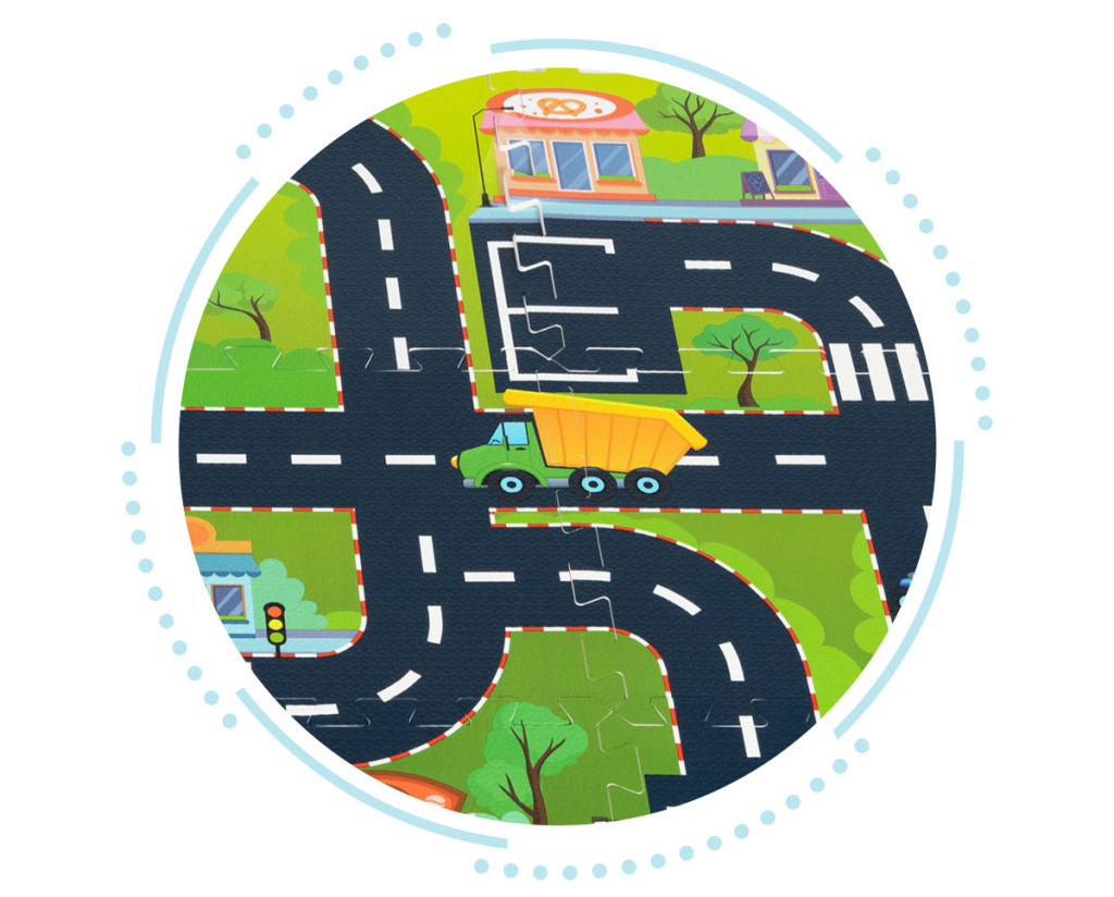 A szőnyegen várost, utakat és utcákat ábrázoló minta található. Ezeknek köszönhetően kreatív és nagyszerű szórakozási formát biztosít a kis autók és járművek szerelmeseinek. Minden részlet élénk színű és gondosan tervezett, hogy a gyermekeket felfedezésre és interakcióra ösztönözze. Az séta, kúszás, pihenés megtanulására vagy pikniktakaróként is használható.