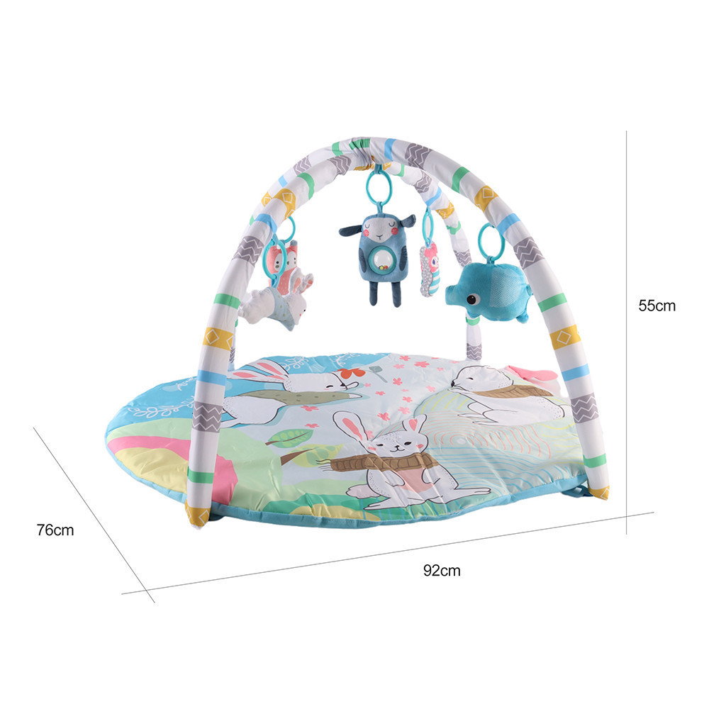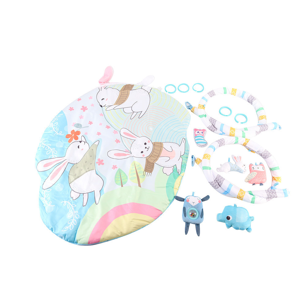 Ez a színes játszószőnyeg tökéletes választás, ha szeretnél egy kényelmes, biztonságos és fejlesztő környezetet biztosítani kisbabádnak. A szőnyeg puha anyagból készült, élénk nyuszis mintákkal, amelyek felkeltik a baba figyelmét. A szőnyeg mérete 92 × 76 cm, így bőven van hely a játékhoz, a párnázott kialakítás pedig kényelmet ad a hason fekvéshez is.