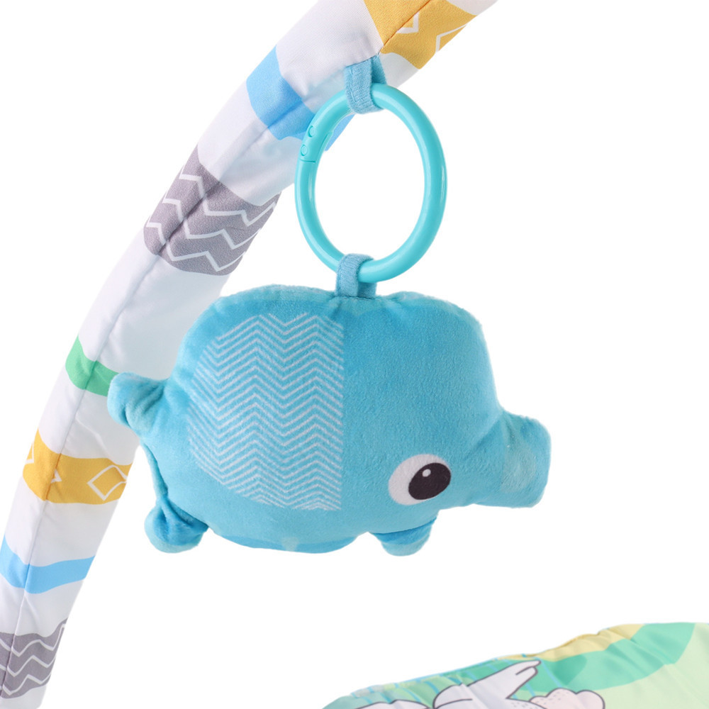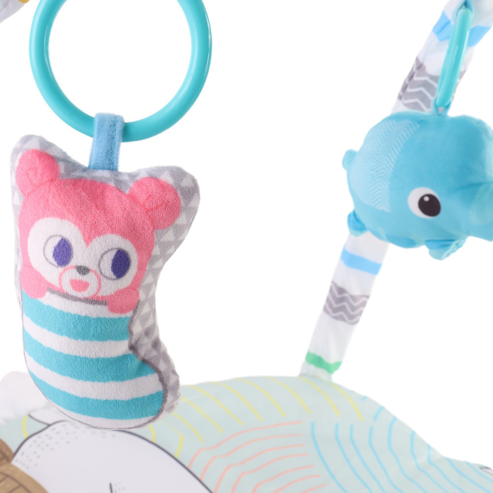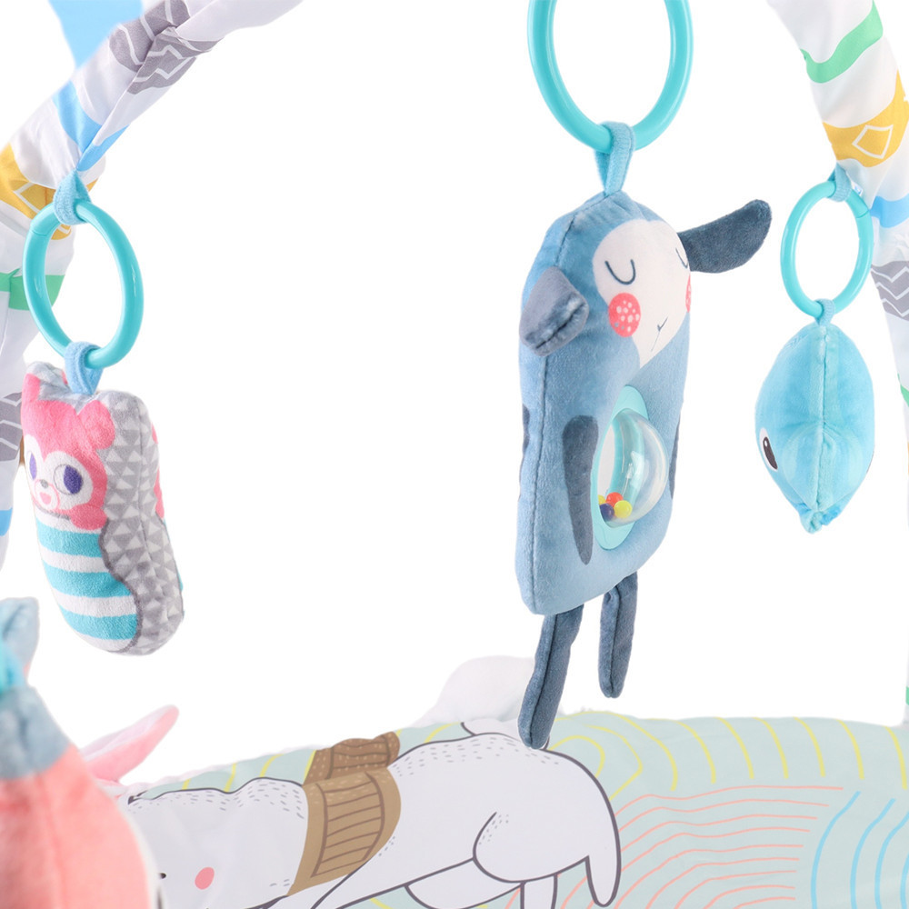 A játékhídon 5 db plüss játék található, köztük nyuszi, bagoly, cica, delfin és egy csörgős bárány figura. A puha játékok levehetők, így külön is használhatók. A játékok különböző textúrái, hangjai és színei fejlesztik a baba látását, hallását és tapintását.