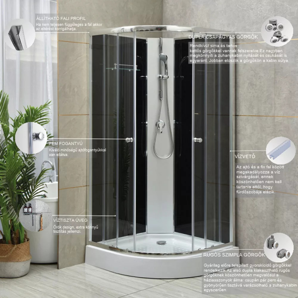 Marco Black II 80x80 cm íves fekete hátfalas zuhanykabin zuhanytálcával